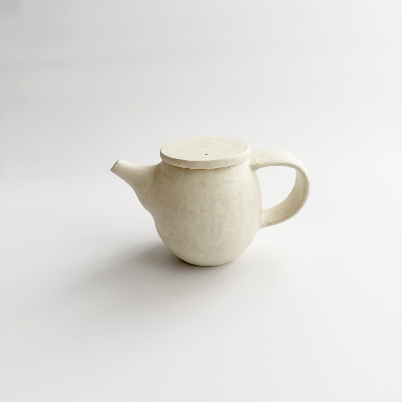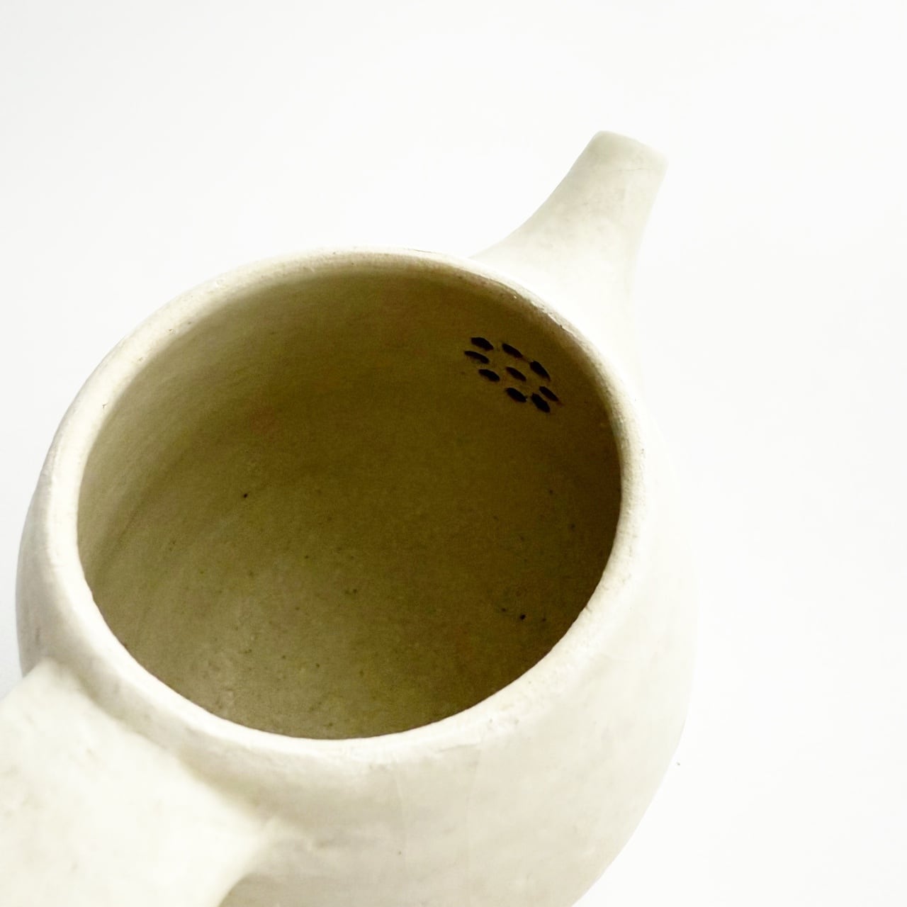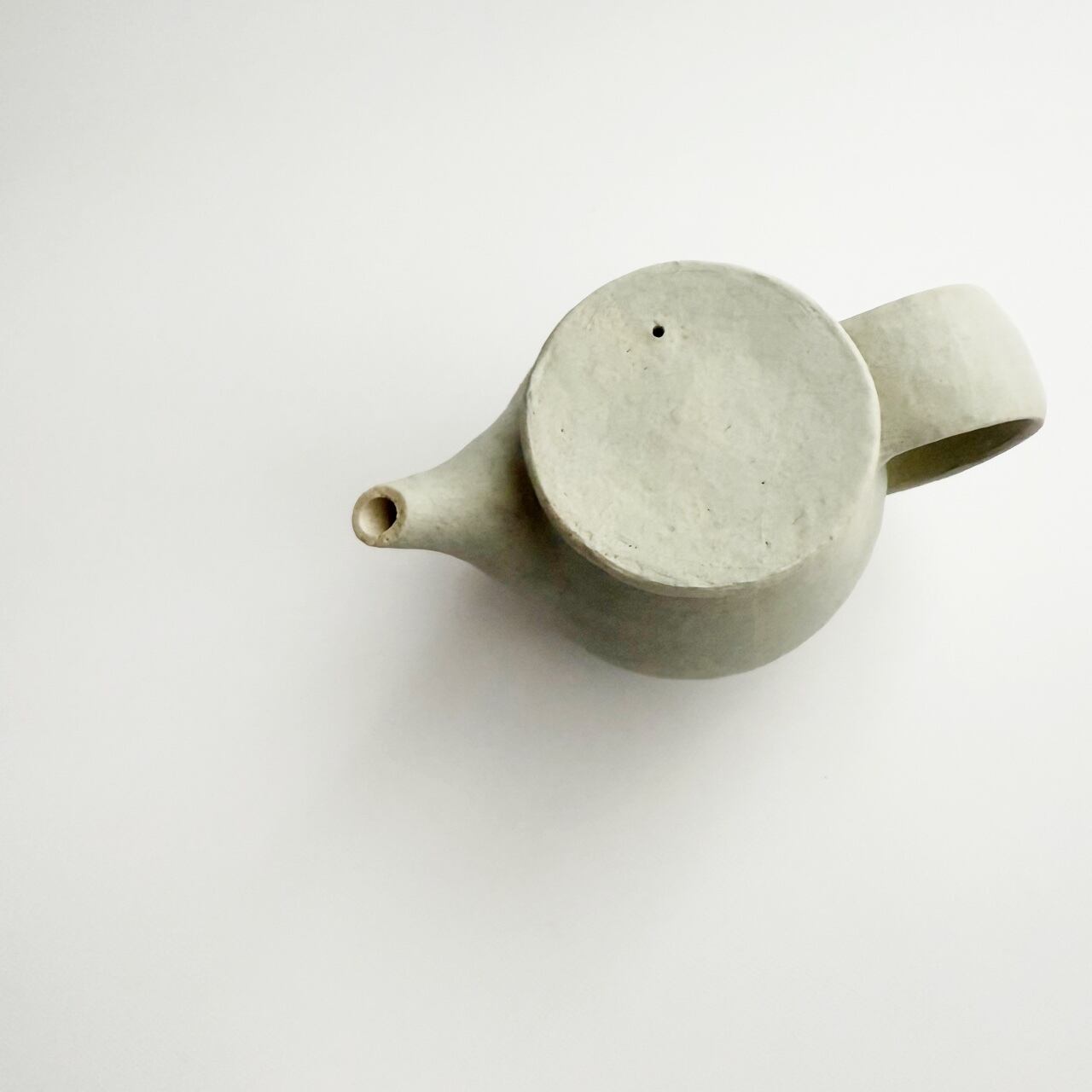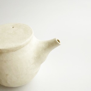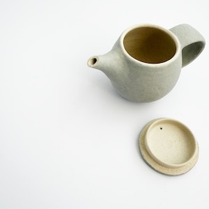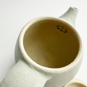 外側の白化粧にマットな釉薬が施してある、定番の雲シリーズと朝靄シリーズの急須です。容量約230ccと小ぶりですが、ひとりの時間を楽しみたい時にちょうど良いサイズ。急須はお使いになる方の感覚がお一人ずつ違うので、手にとってお選びいただける時のみの販売を心掛けてきました。ラフな作りをしていますので、そんな雰囲気が好きと思ってくださる方にお使いいただけたらいいなと思って今回限りonline storeにてご紹介を。大きな持ち手は安心感があります。高台含め全面に釉薬を施してあるので、テーブルを傷つけたりしません。茶漉しは画像でご確認ください。細かな茶葉は通します。