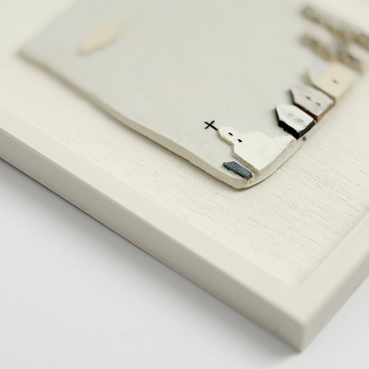 陶板は、手仕事で作った木製の額に納めています。壁に掛けたとき、陶板の輪郭にわずかに淡い影が落ち、空間に静かな奥行きを生み出します。
