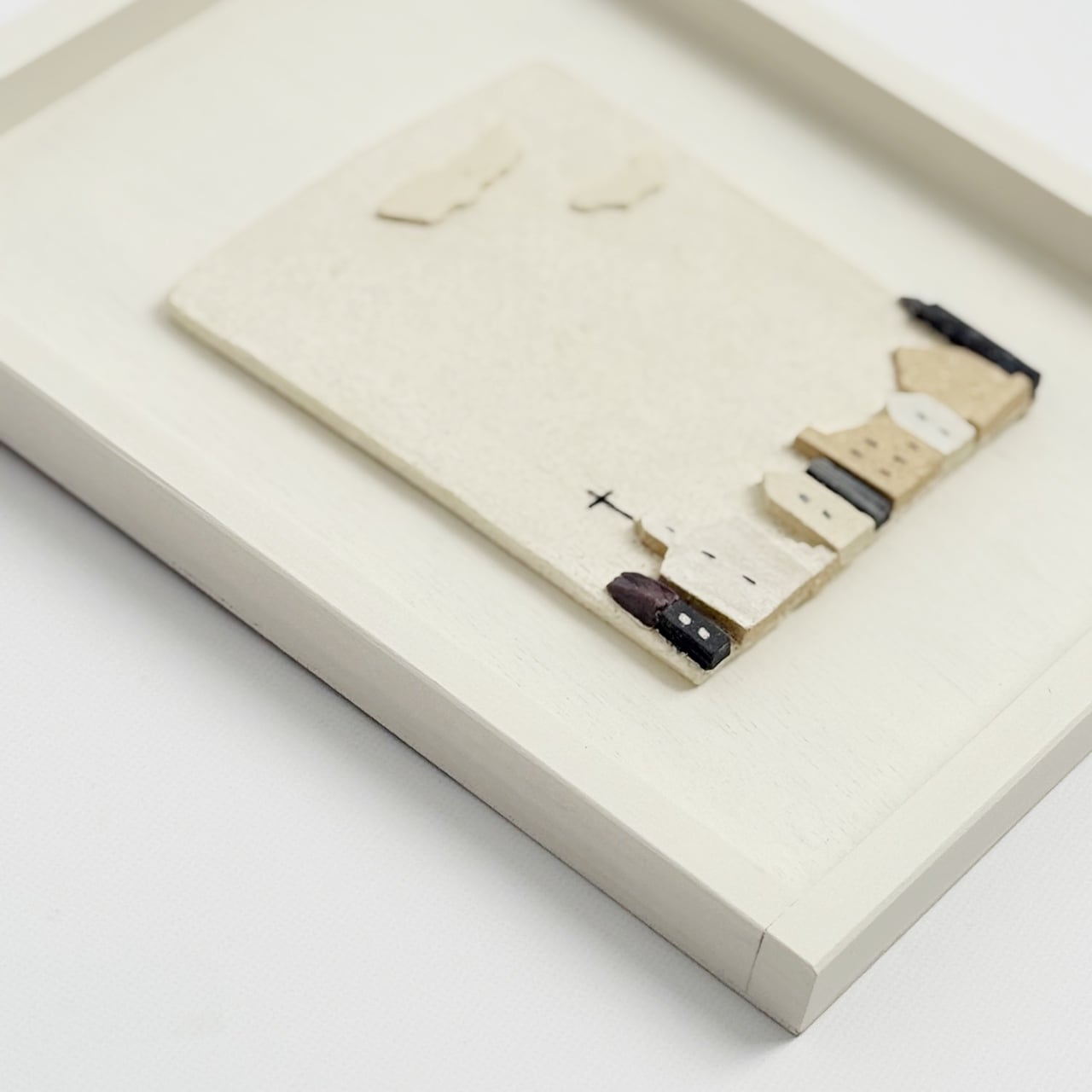 陶板は、手仕事で作った木製の額に納めています。壁に掛けたとき、陶板の輪郭にわずかに淡い影が落ち、空間に静かな奥行きを生み出します。