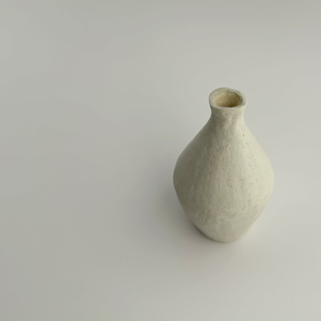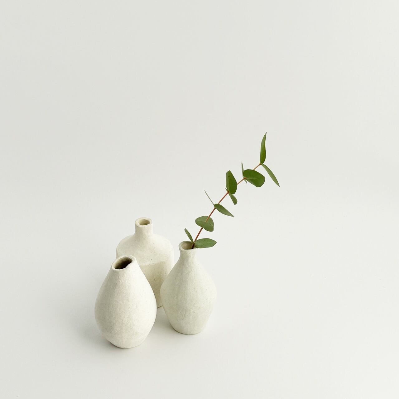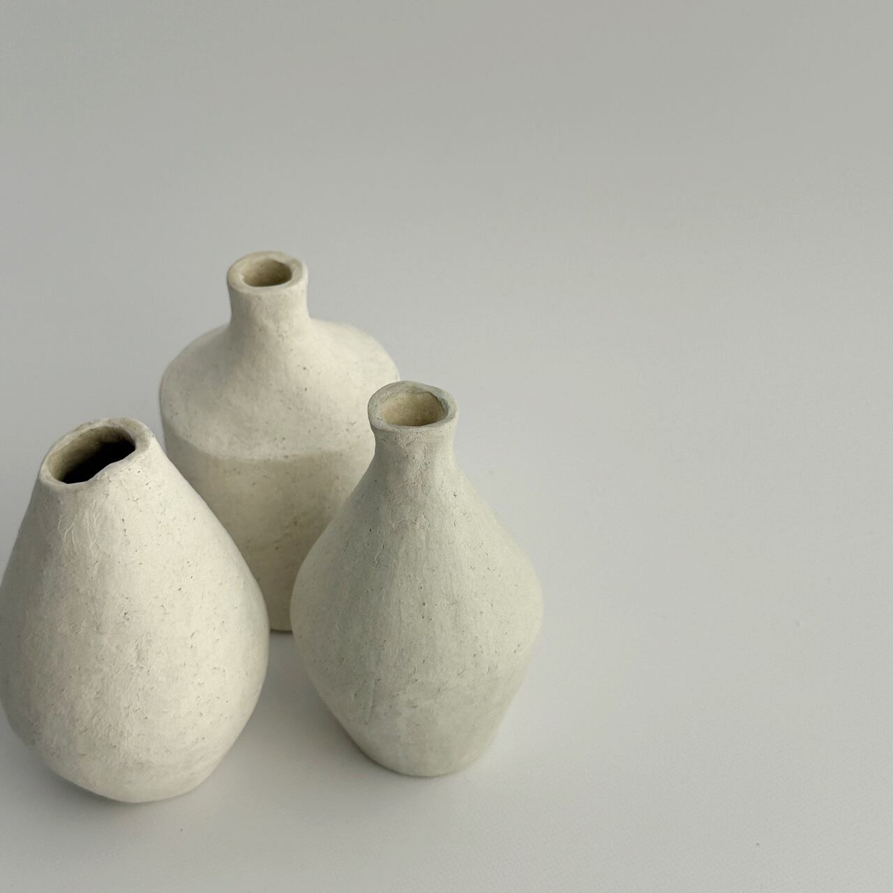 手びねりでひとつずつ形を作りました。淡い朝靄色の化粧を施し、やわらかな雰囲気に仕上げています。花を迎える時間が静かで豊かなものになりますように。