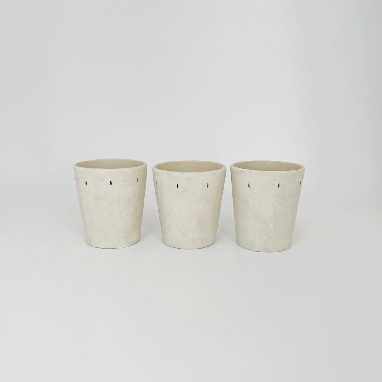 定番の白色をベースに黒色の小さな雨粒をいくつか降らせた「小雨」。コップの形ですが、お茶、珈琲、白湯…日々お好きな飲み物をお楽しみ下さい。陶器はお酒類の匂いがつきやすいのですが、専用にしてしまえば気になりませんね。白化粧には少し貫入(ヒビのようなもの)が入っていて、すでに何年か使い込んだかのような雰囲気。片手にすっぽりおさまるサイズです。
