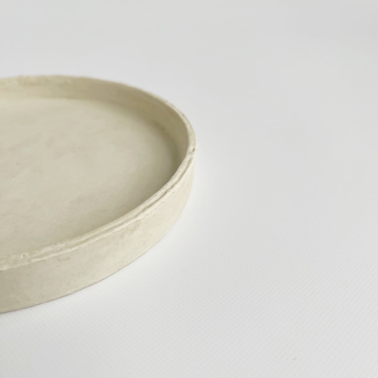 色は雲シリーズの白。以前作っていたものを雲シリーズに仕立て直しました。底が平らな円形で、縁はあえてロクロ挽きっぱなしのラフな仕上げになっているプレートです。取り皿、焼き菓子、小さめのケーキなどにもちょうど良い大きさ。お香たてなどにお使いいただけます。