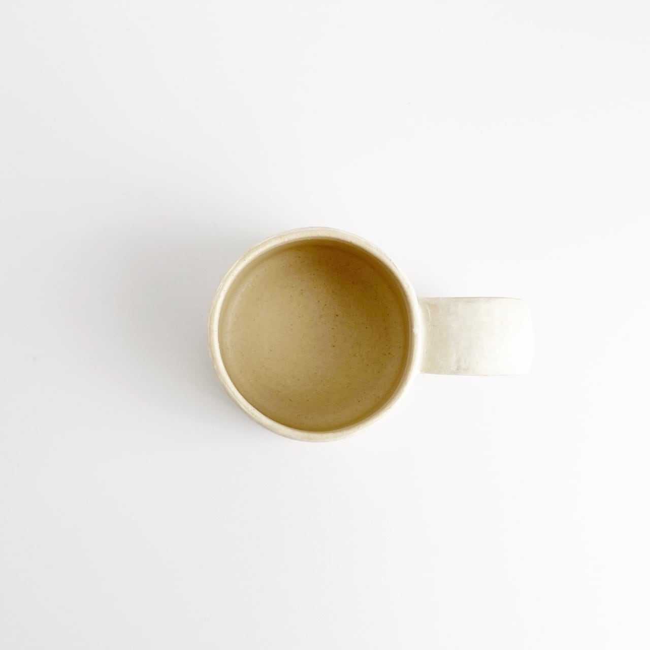 軽く、持ち心地の良いカップは外側の白化粧にマットな釉薬が施してある、定番の雲シリーズです。ニュアンスのある白色はどんな飲み物とも相性が良く飽きもきません。コロンとしているので私は両手で包み込みつつゆっくりするのが好きです。ホッと一息つくときや考え事をする時はこのカップがいいなぁと思っています。高台を含め全面に釉薬を施してあるのでテーブルを傷つけたりしません。