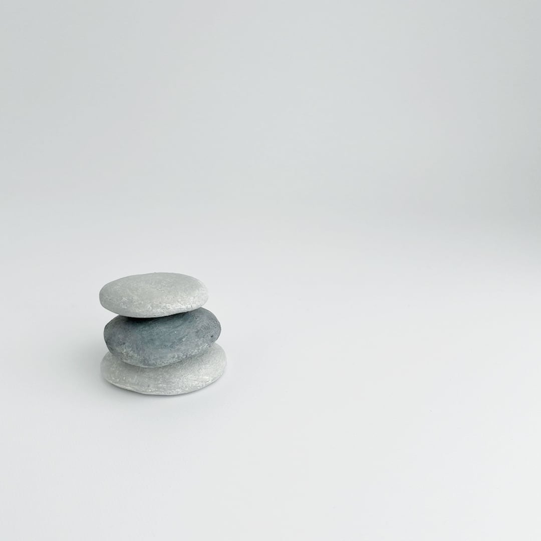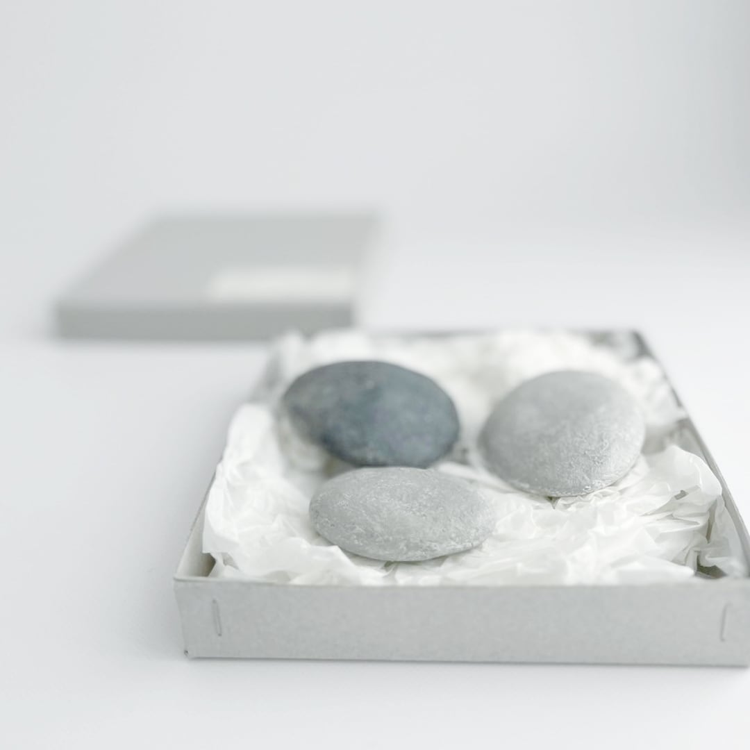 河原の石をイメージしながら粘土で石を作り、白化粧を何度も施し、磨き、丁寧に焼き上げました。その上に絵を描くようにアクリル絵の具を塗り重ね、様々な表情に仕上げてあります。石を積み上げて飾る、標本のように飾る。または積んで遊んだり、ペーパーウェイトとしてお使いいただいたり、思うままにお楽しみ下さい。