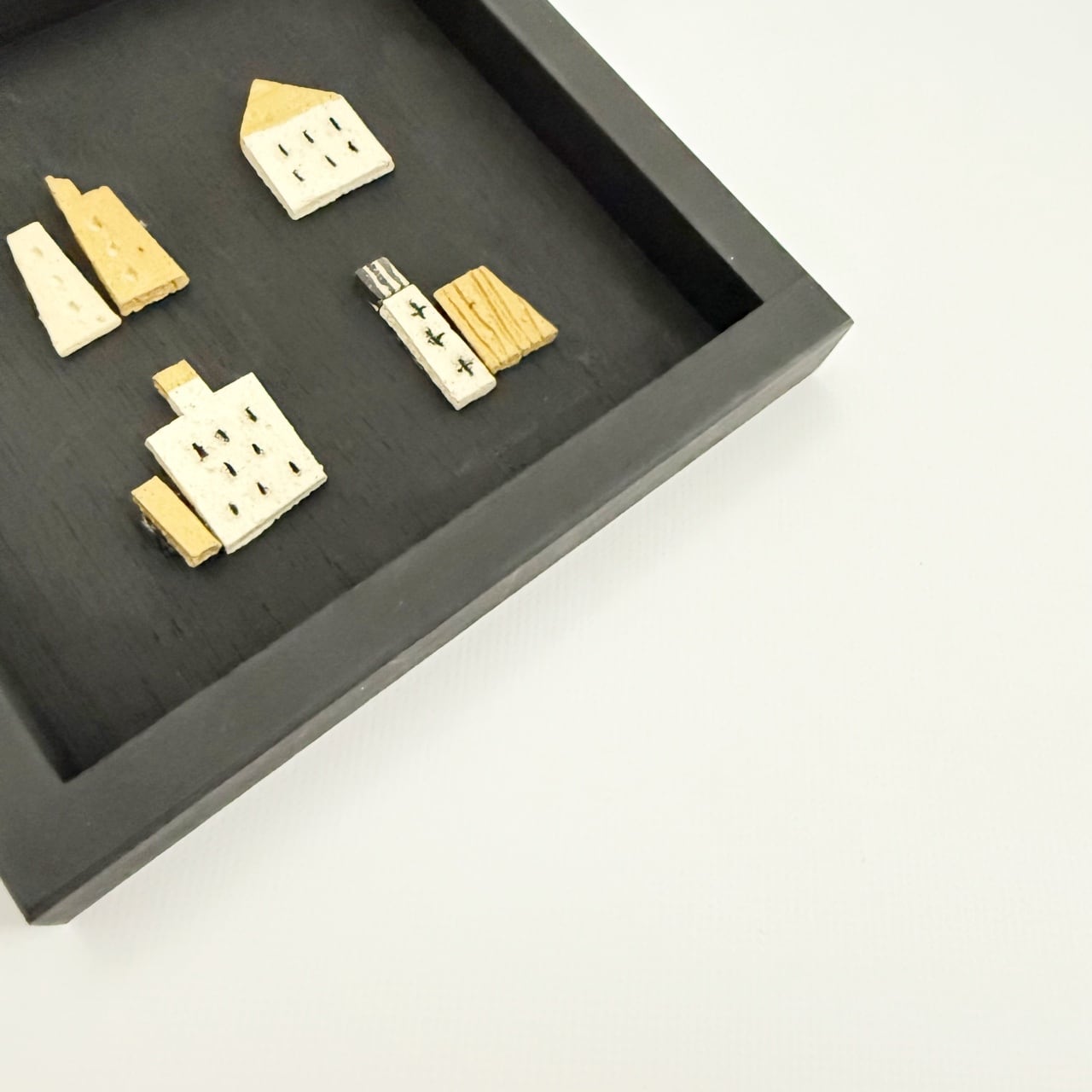 月夜の晩には月に照らされた家々が光っているように見えたり。新月の晩には家に灯った小さな明かりがあたたかに光って見えたり。そんな夜の街のイメージをフレームにおさめました。